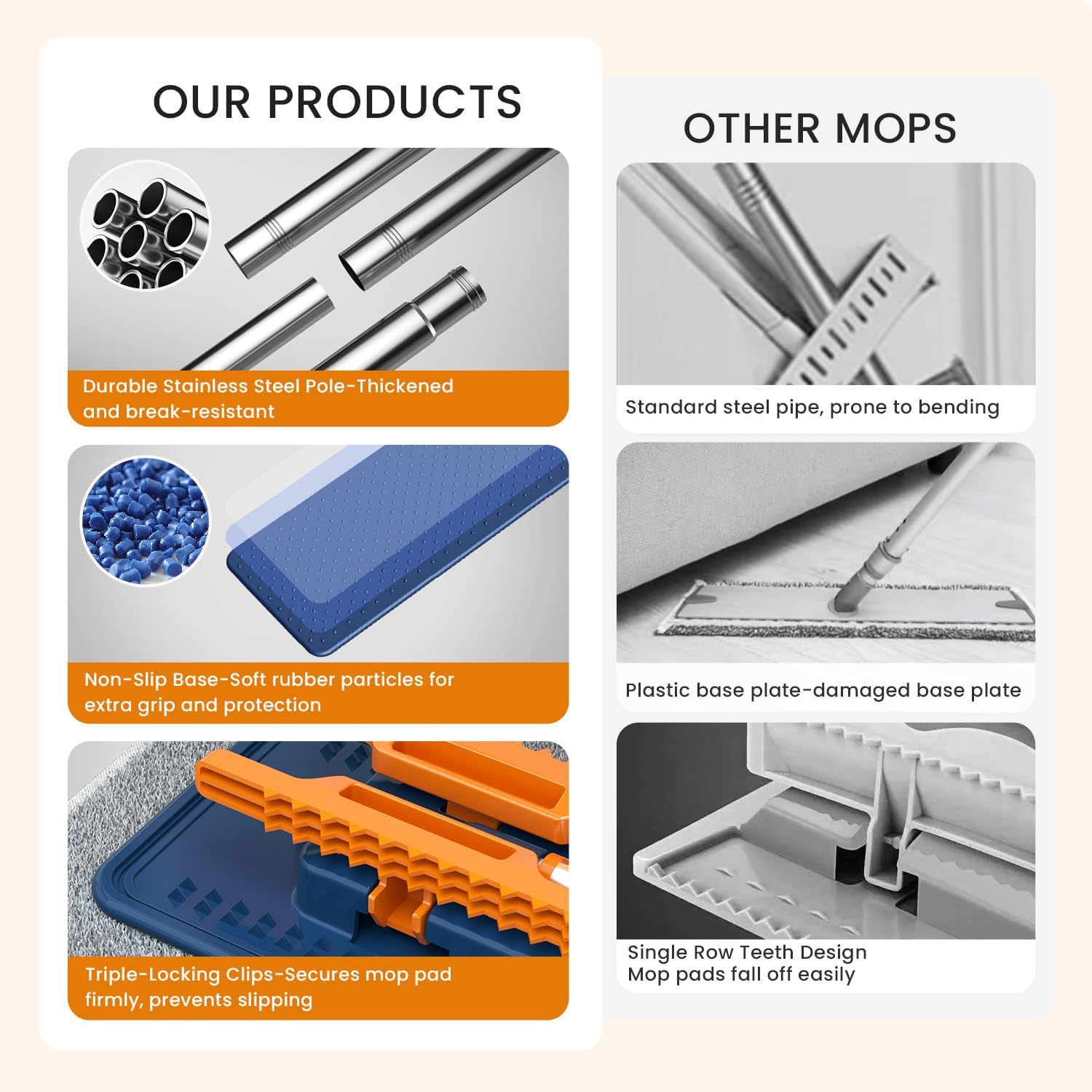 【Profeesional Flat Mop】Designed for heavy-duty and commercial dust mop comes with triple-locking clips - holds the mop pad firmly in place, preventing it from slipping, easy to replace and clean. A good choice for office floors, restaurant floors, kitchen floors, bathroom floors, garages, gym, warehouses and so on.
