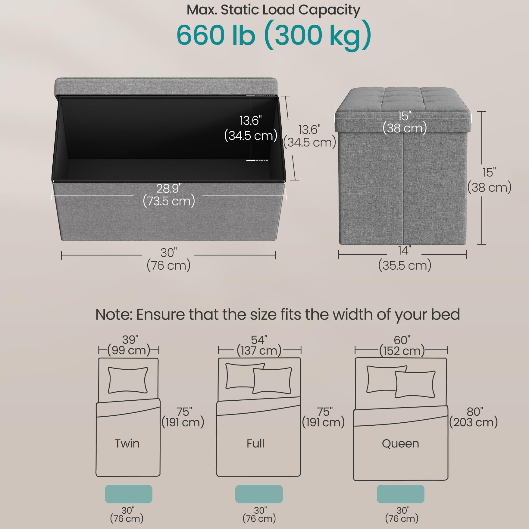 【CONVENIENT STORAGE】Measuring 15"D x 30"W x 15"H (38 x 76 x 38 cm) with a total volume of 24 gallons (89 L), this storage ottoman neatly organizes your bed sheets, pillows, blankets, and magazines