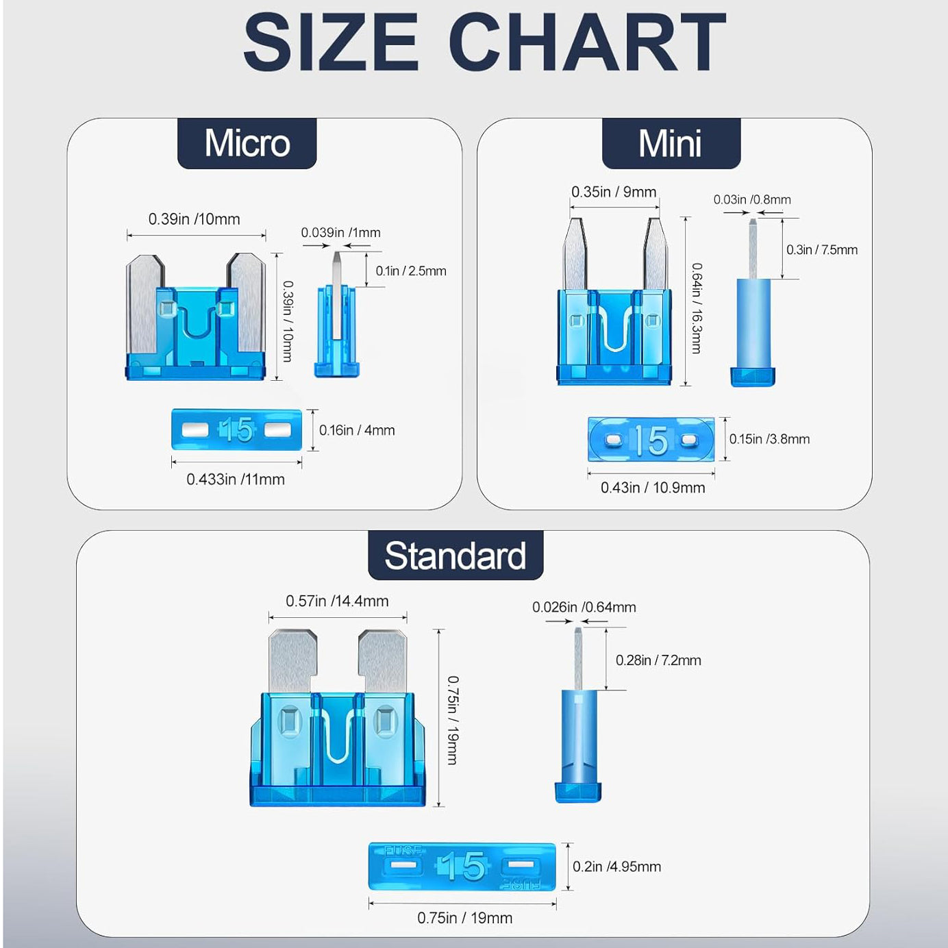 【Meet all your needed size】-- The fuse kit includes micro size 50pcs, mini size 160pcs and standard size 90pcs. Three styles of auto fuses have 11 current specifications (2A /3A / 5A/ 7.5A/ 10A/ 15A/ 20A/ 25A / 30A/ 35A/40A), equipped with a fuse puller.(Not including micro2 fuse.)