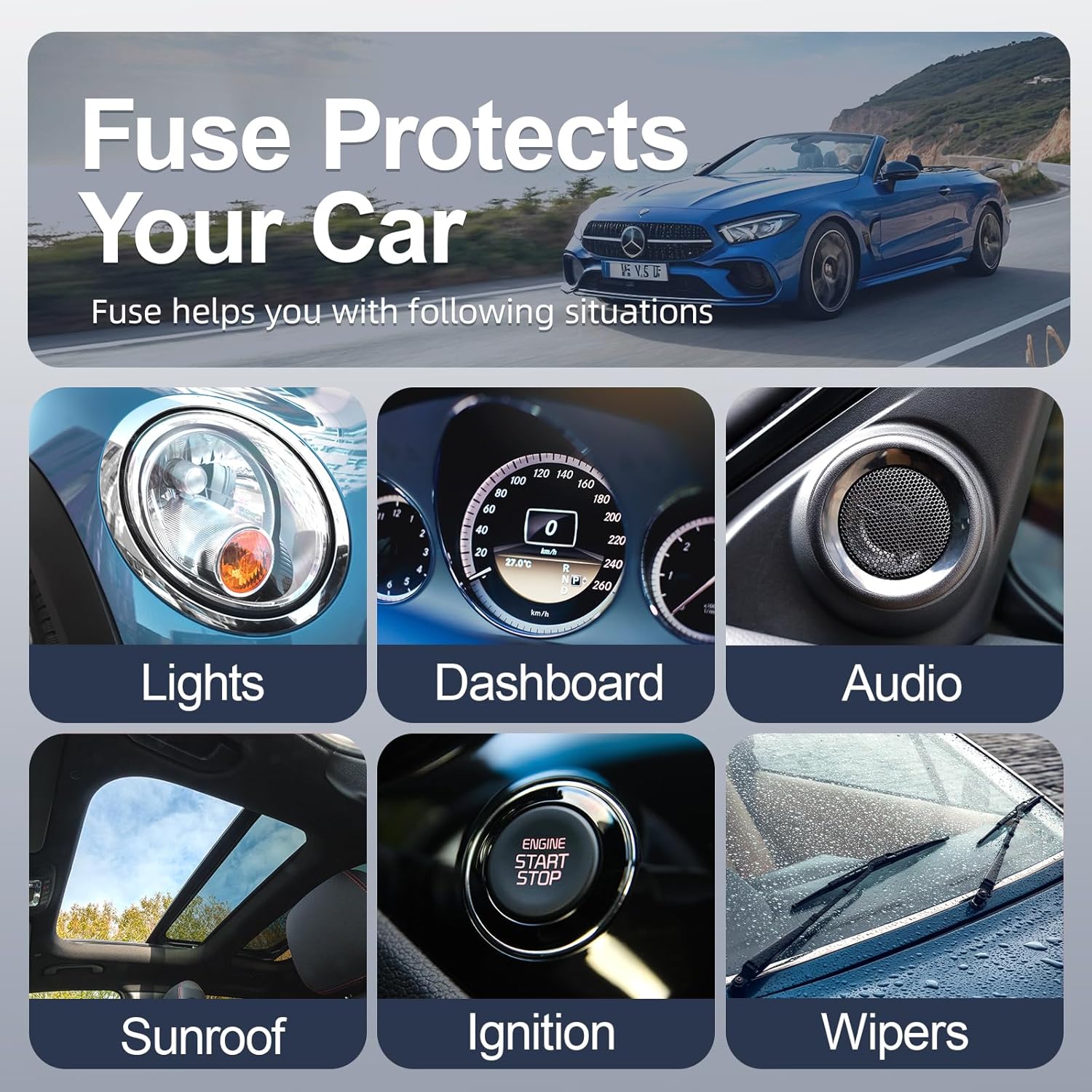 【High quality and wide application】-- The fuse is made of environmentally friendly plastic and zinc alloy. The blade fuses are suitable for cars ,RV, truck, motorcycles, boats,SUV, ATV, UTV, Camper RV, Motorcycles, etc.But not for(Ford F,2014 Ram 1500,Hyundai Tucson 2018,RAM 2500,2016 jeep cherokee).