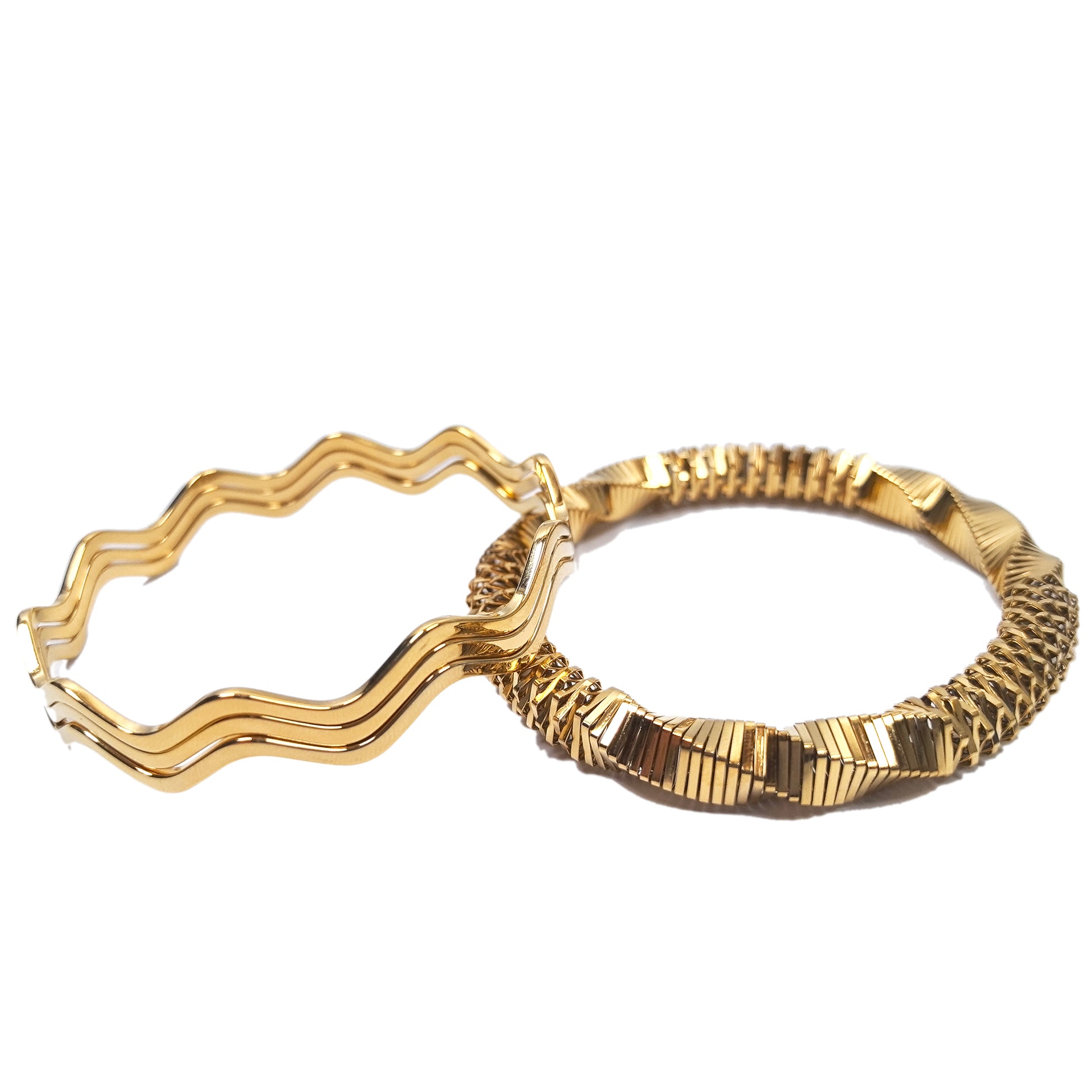 4-Piece Gold Bangle Stacking Set: 3 Thin Wave Bangles + 1 Textured Spring Cuff, Stainless Steel Gold Plated Wrist Jewelry for Women