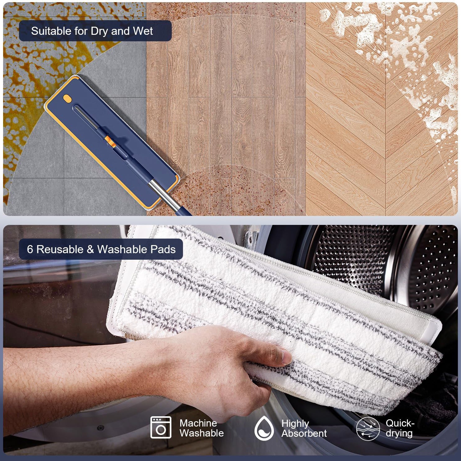 【Wash & Dry】The fixed brush in the washing chamber removes dirt from the wet mop for deep cleaning and keeps you away from dirty water; the drying chamber is designed with an oscillating squeegee, which helps the cleaner mop squeeze out the water more thoroughly, cleaning the dusting of floors, walls, and windows more efficient