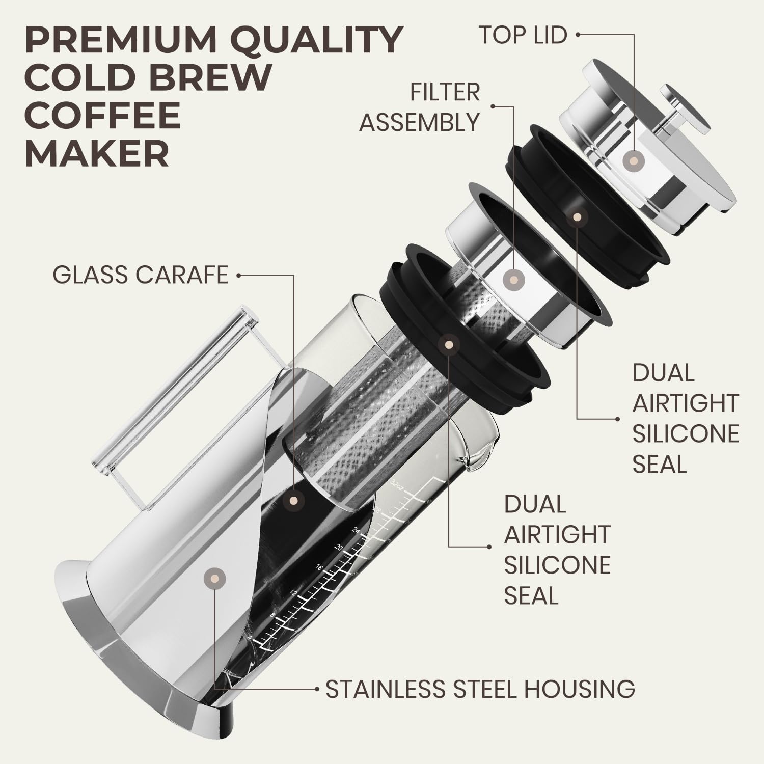 GLASS COLD BREW PITCHER: The cold brew coffee maker glass carafe withstands temperature changes, preserving fresh flavor. Built in measuring label ensures consistent, perfect results every time